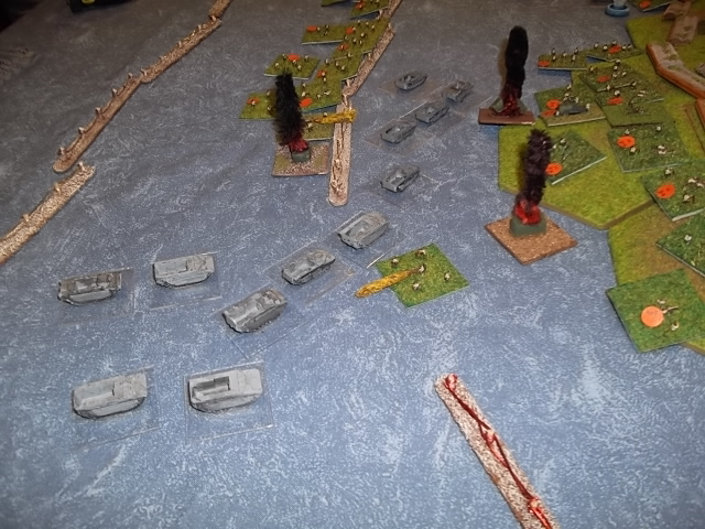 This will be a pain in the real battle. It not only holds up infantry for a turn to cross but also kills a vehicle on a '6' - every time they cross the wire (coming in and going back). This is to simulate Japanese mines / tetrahedrons etc. In hindsight this can be horrificly damaging (see below) and creates a priority for engineers to clear paths through the wire before the Amtracs are blown to bits.