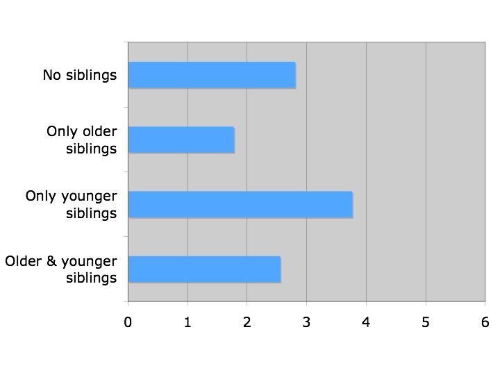 Here are the results for the children, divided up according to the siblings in their family. The striking finding is that autistic kids who had older siblings did worse than those with no older siblings. Children with only older siblings (ie those who were the youngest in their family) performed worst of all.